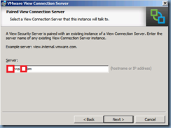 In the Paired View Connection Server step, enter the hostname or IP address of your internal View Connection server: