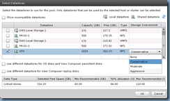 Once you select the datastore that you intend on using for your virtual desktops, you also notice that options for the Storage Overcommit becomes accessible and the default is set to Conservation: