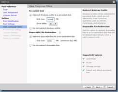 How big you want your persistent disk to be for redirecting profiles would depend heavily on your Active Directory domain environment so in an environment where you don’t use Active Directory to redirect profiles via GPOs, your persistent disk would most likely be bigger. For this example, I’ve set the disk size to 10GB so if I were to have 50 virtual desktops, I would need to account for 50GB worth of space just for persistent disks and another 200MB for non persistent disks (4GB each):